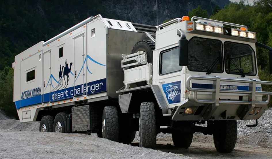 Внедорожный автодом Desert Challenger: 600 л.с., 4 оси и автономность для экстремальных условий Роскошный автодом на базе военного шасси MAN KAT 1 A/1 способен неделями обходиться без внешней поддержки Фото: Desert Challenger /actionmobil.com