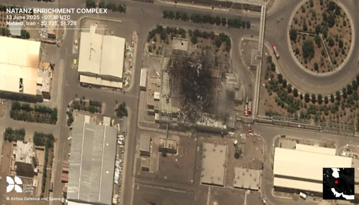 Организация Open Source Centre опубликовала спутниковые снимки объекта в Натанзе после атаки Израиля (на фото). На снимке видны значительные повреждения. В Натанзе расположег главный иранский центр по обогащению урана.