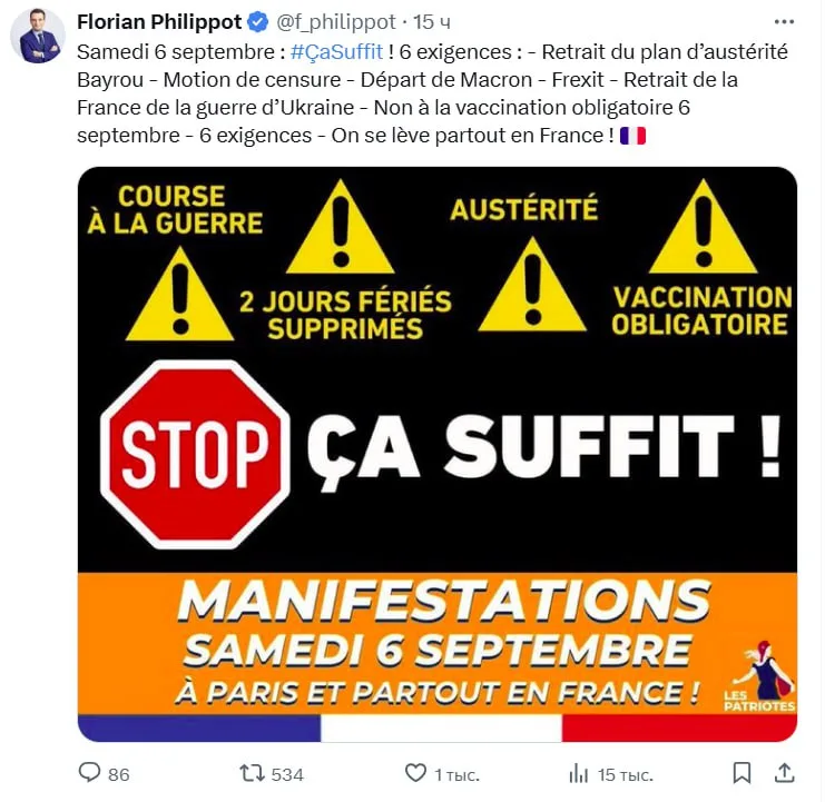 Филиппо также призвал к вотуму недоверия Макрону и призвал граждан поднимать восстание по всей Франции.