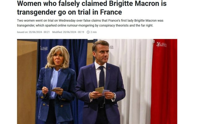 Две женщины, одна из которых представилась независимым журналистом, ранее заявили, что супруга президента Франции до 30 лет была мужчиной. Ее якобы звали Жан-Мишель Тронье, при том что Тронье — это девичья фамилия Брижит. В качестве доказательств они привели фотографии мужчины, имеющего сходство с Брижит – видео набрало такую огласку, что Макрону даже пришлось публично опровергать эти слухи.