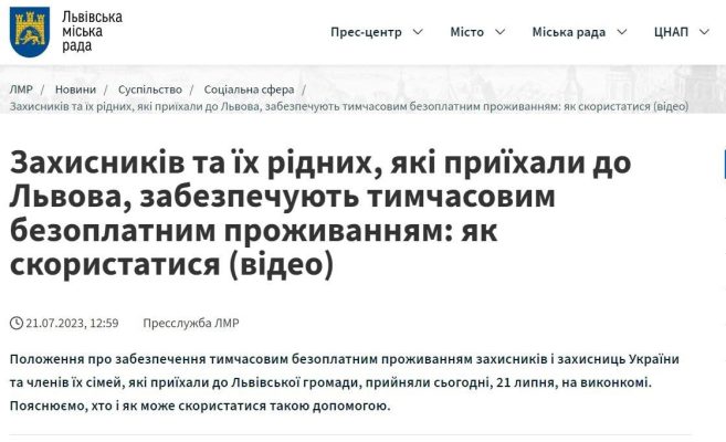 Одновременно с этим, львовская администрация официально разместила у себя на сайте объявление о предоставлении временного жилья всем боевикам ВСУ и их родственникам, которые по тем или иным причинам находятся во Львове.