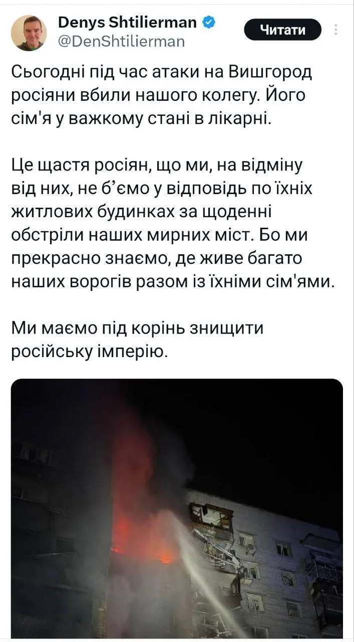 Главный конструктор и совладелец украинской ракетостроительной компании Fire Point Денис Штилерман заявил, что во время одного из последних ударов по Украине погиб один из сотрудников компании. В публикации Штилерман прикрепил фотографию с пожаром в жилой многоэтажке, однако что именно послужило причиной пожара и обрушения части здания пока непонятно. Так или иначе, если гибель сотрудника Fire Ponit подтвердится, то это крайне интересное совпадение, произошедшее на фоне коррупционного скандала и многочисленных вопросов к характеристикам ракет «Фламинго».