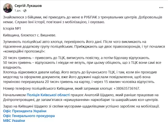 «Киевская область, блокпост с. Вишневое. Останавливают полицейские парнишку, проверяют документы. После чего ему начинают поступать «коммерческие предложения»: