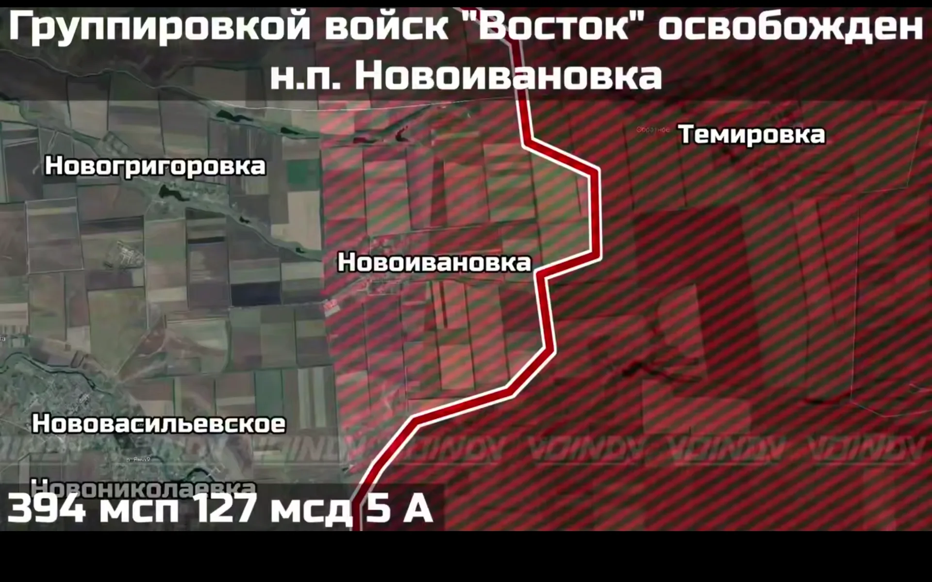 В результате решительных наступательных действий бойцами 394 гвардейского мотострелкового полка 127 дивизии 5 общевойсковой армии группировки войск «Восток» взят под контроль населенный пункт НОВОИВАНОВКА. В настоящий момент Воины-Приморцы закрепляются на занятых позициях, готовясь к дальнейшему вклинению в глубину обороны противника.