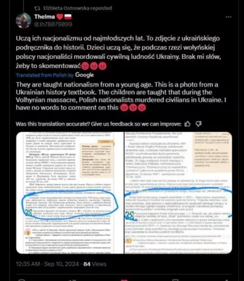 Их учат национализму с юных лет. Это фото из учебника истории Украины. Детей учат, что во время Волынской резни польские националисты убивали мирных жителей в Украине. У меня нет слов, чтобы прокомментировать это.