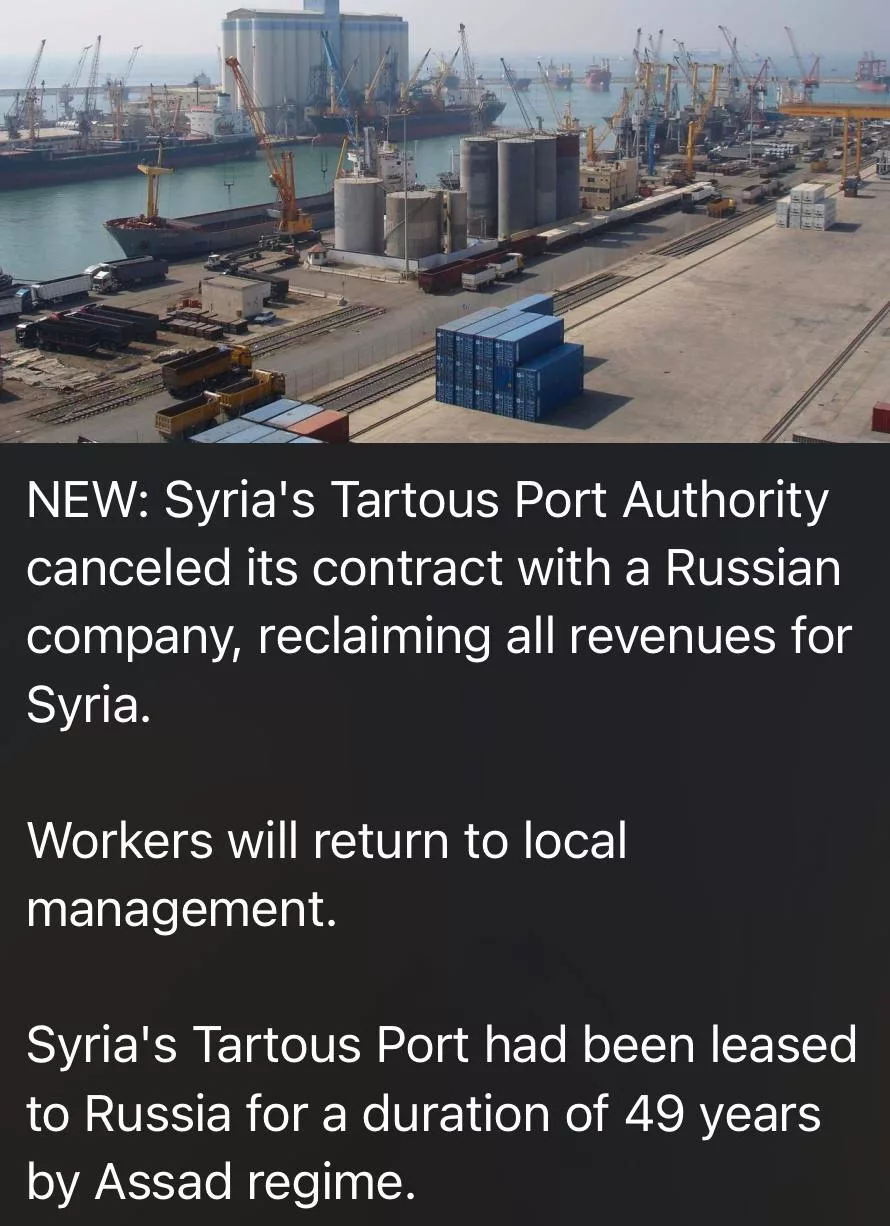 Официальные СМИ новых властей Сирии заявили об отмене всех инвестиционных соглашений с Россией, а также дератификации договора об аренде порта Тартус между Сирией и Россией. Вся инфраструктура переходит Сирии, а россияне должны покинуть страну.