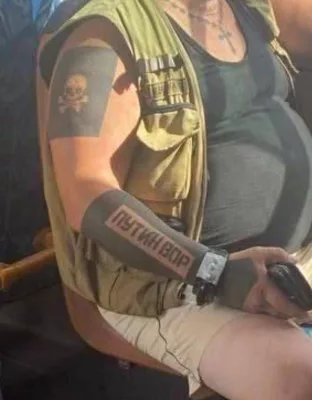 На этом человеке нет ни матерных слов, ни свастик, ни другой запрещённой атрибутики. А собственное мнение не является уголовно-наказуемым преступлением. Да и вообще любые такие надписи не являются.