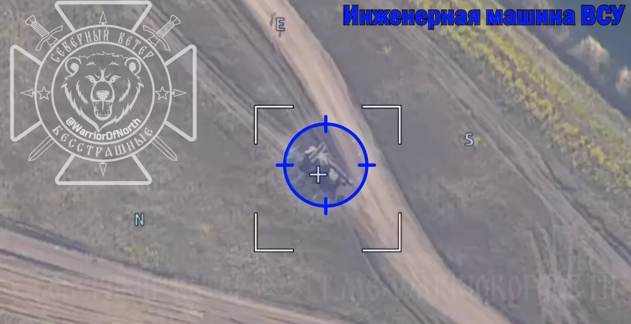 Инженерная машина получила прямое попадание «Ланцетом» группировки «Север». Попытки экипажа потушить пожар не увенчались успехом.