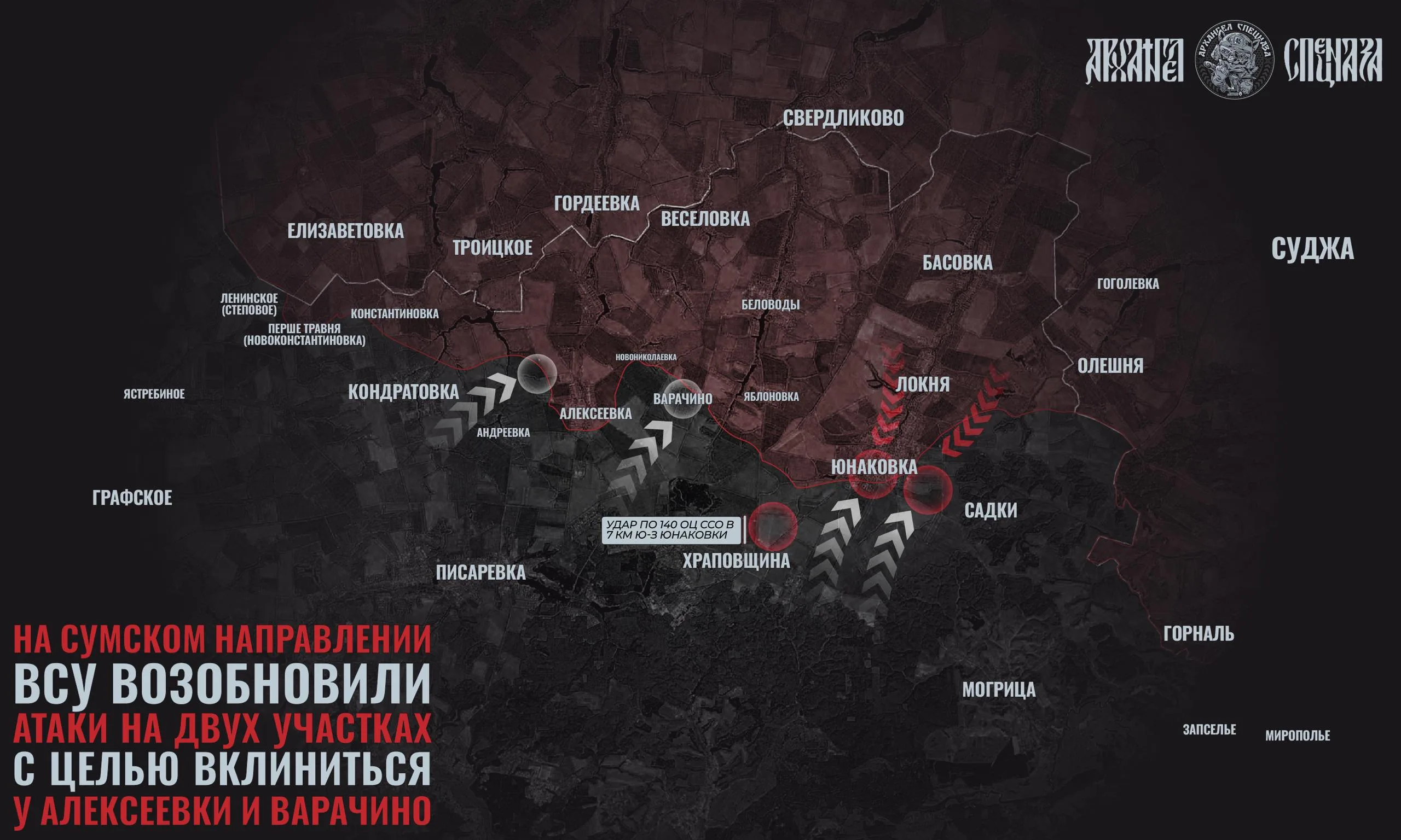 В Сумской области украинские формирования силами двух штурмовых групп 3 отряда СпН 71 ЕБр предпринял попытку возврата ранее утраченных позиции в районе 2 км юго-западнее Варачино, но безуспешно. Егеря понесли потери в живой силе и технике и отступили на исходный рубеж обороны.