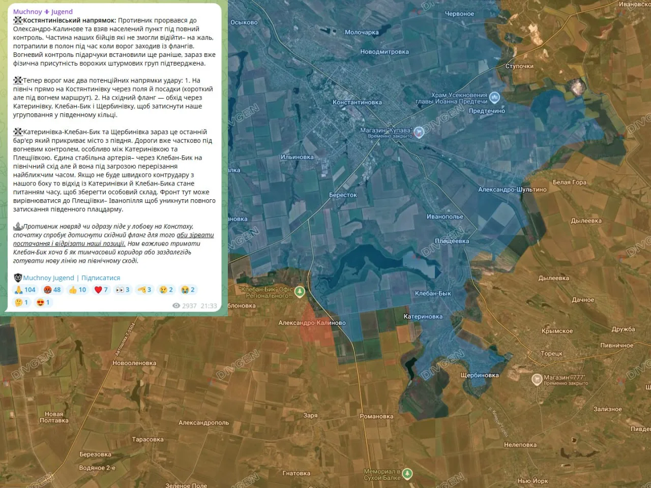 Теперь враг имеет два потенциальных направления удара: 1. На север прямо на Константиновку через поля и посадки (короткий, но под огнём маршрут). 2. На восточный фланг — обход через Катериновку, Клебан-Бык и Щербиновку, чтобы зажать нашу группировку в южном кольце.