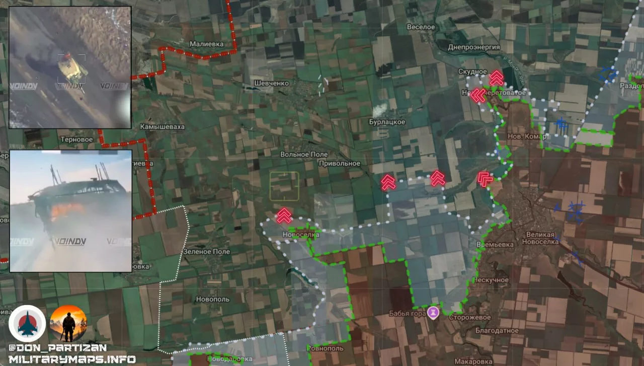 - Полностью освобождён н.п. Новоочеретоватое, где завершена зачистка территории, а российские силы укрепляют рубежи. В данный момент бои продолжаются в направлении Скудного, а также вдоль восточного берега реки Мокрые Ялы, где российские подразделения ведут штурмовые действия для дальнейшего выхода к Днепроэнергии.