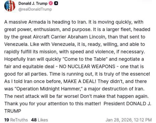 Президент США выкатил очередной экспрессивный пост с восклицаниями и капслоком, где заявил, что к берегам Ирана движется огромная армада – еще мощнее той, что была отправлена к Венесуэле.