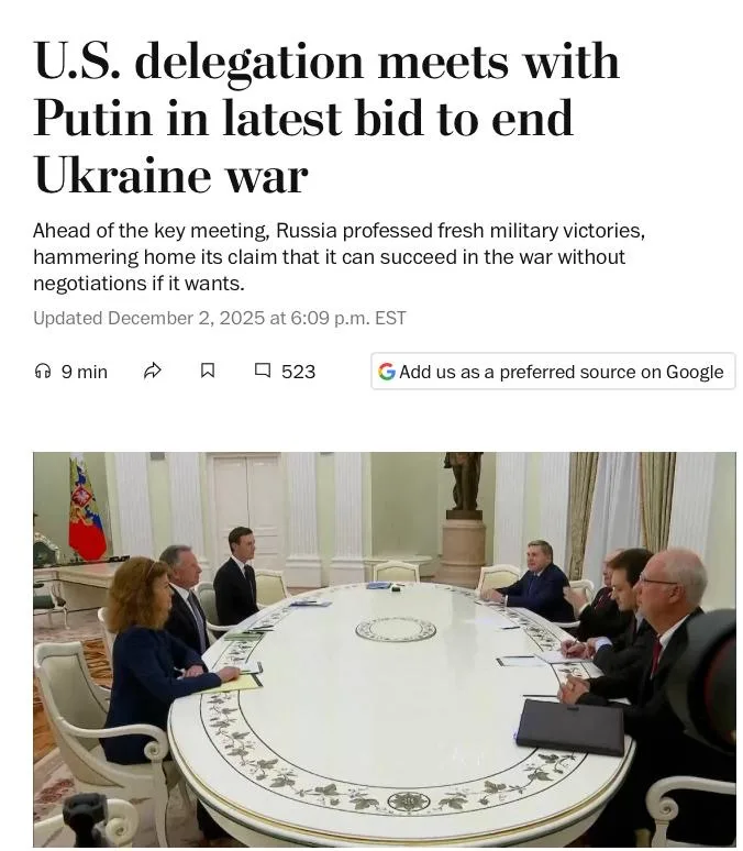 ▪️NBC News пишет, что Москва не готова уступать по ключевым пунктам плана Трампа, а Рolitico напоминает, что ни предыдущие переговоры, ни саммиты, ни визиты Уиткоффа не изменили позицию Кремля.