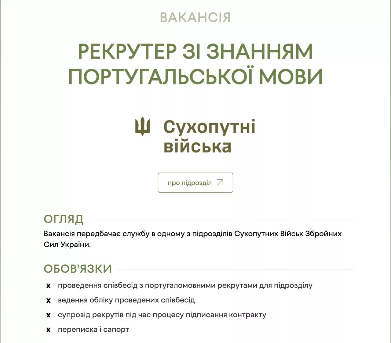 Указано, что в их обязанности будет входить «проведение собеседований с португалоязычными рекрутами для подразделения».