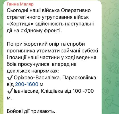 Говорящая голова ВСУ Маляр сообщает, что боевики группировки «Хортица» идут в наступление в направлении Орехово-Васильевки, Парасковиевки, Ивановского и Клещеевки.