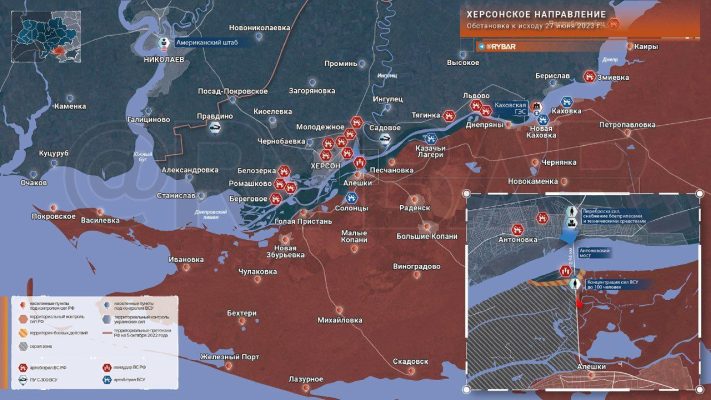 В районе Антоновского моста продолжаются боестолкновения с подразделениями ВСУ, закрепившимися под остатками переправы у Дач на берегу Днепра. Сегодня авиация ВКС России пыталась нанести удар по укрытиям ВСУ на левобережье реки, но безуспешно.