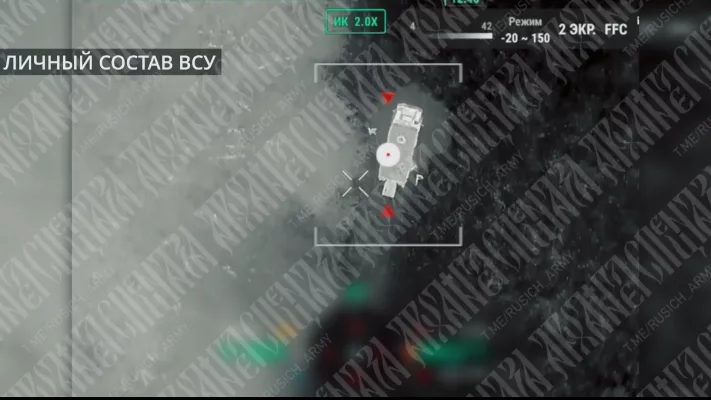Движущаяся группа врага была замечена оператором БПЛА. В процессе сопровождения цели ББМ остановилась, а личный состав вышел.