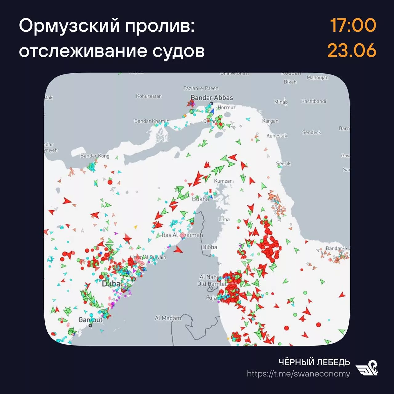На слухах о возможной ответке Ирана за атаку от США сегодня пролив прилично обмелел. Мы специально отслеживали сегодня морской трафик, ближе к вечером судов в узком горлышке осталось очень мало. (см. скрины выше)