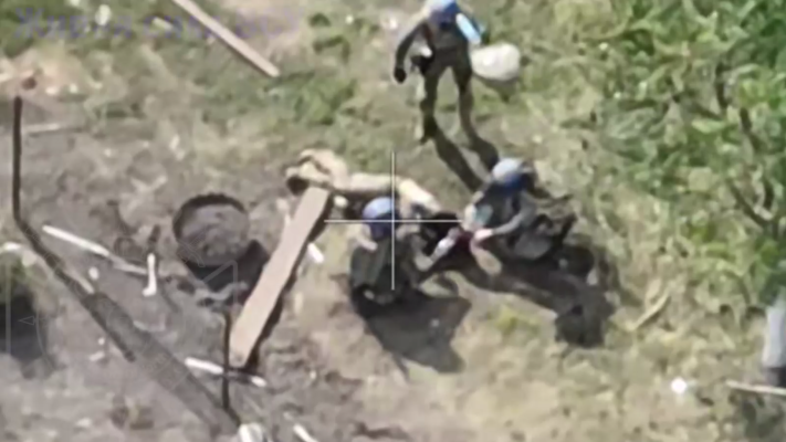 Группа солдат противника из 4 человек попала в объектив БпЛА Северян, когда заносила в сарай своего 300-го. После точного прилета все пятеро 200.