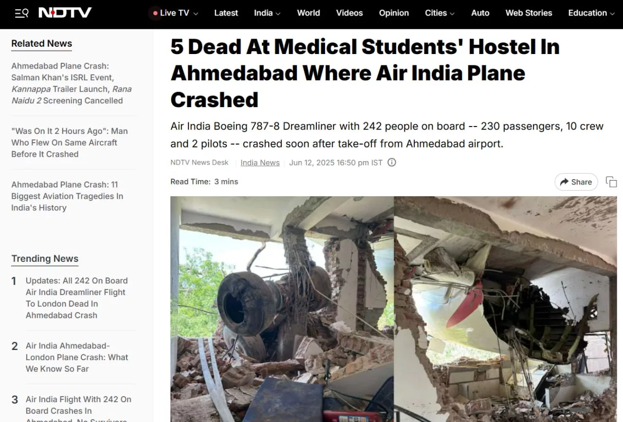 Все 242 человека (230 пассажиров, 10 членов экипажа и 2 пилота), находившиеся на борту разбившегося в Индии Boeing 787 Dreamliner, а также минимум 5 студентов-медиков в общежитии, на которое упал борт, погибли, — сообщает NDTV.