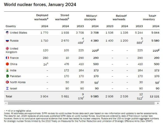 На начало 2024 года девять государств обладали в общей сложности 12 121 ядерной боеголовкой. Из них около 9 585 находились в боеготовности. Порядка 3 904 из этого количества были развернуты на ракетах или воздушных суднах (на 60 больше, чем в январе 2023-го). Около 2100 из развернутых боеголовок находились в состоянии повышенной боевой готовности на баллистических ракетах.