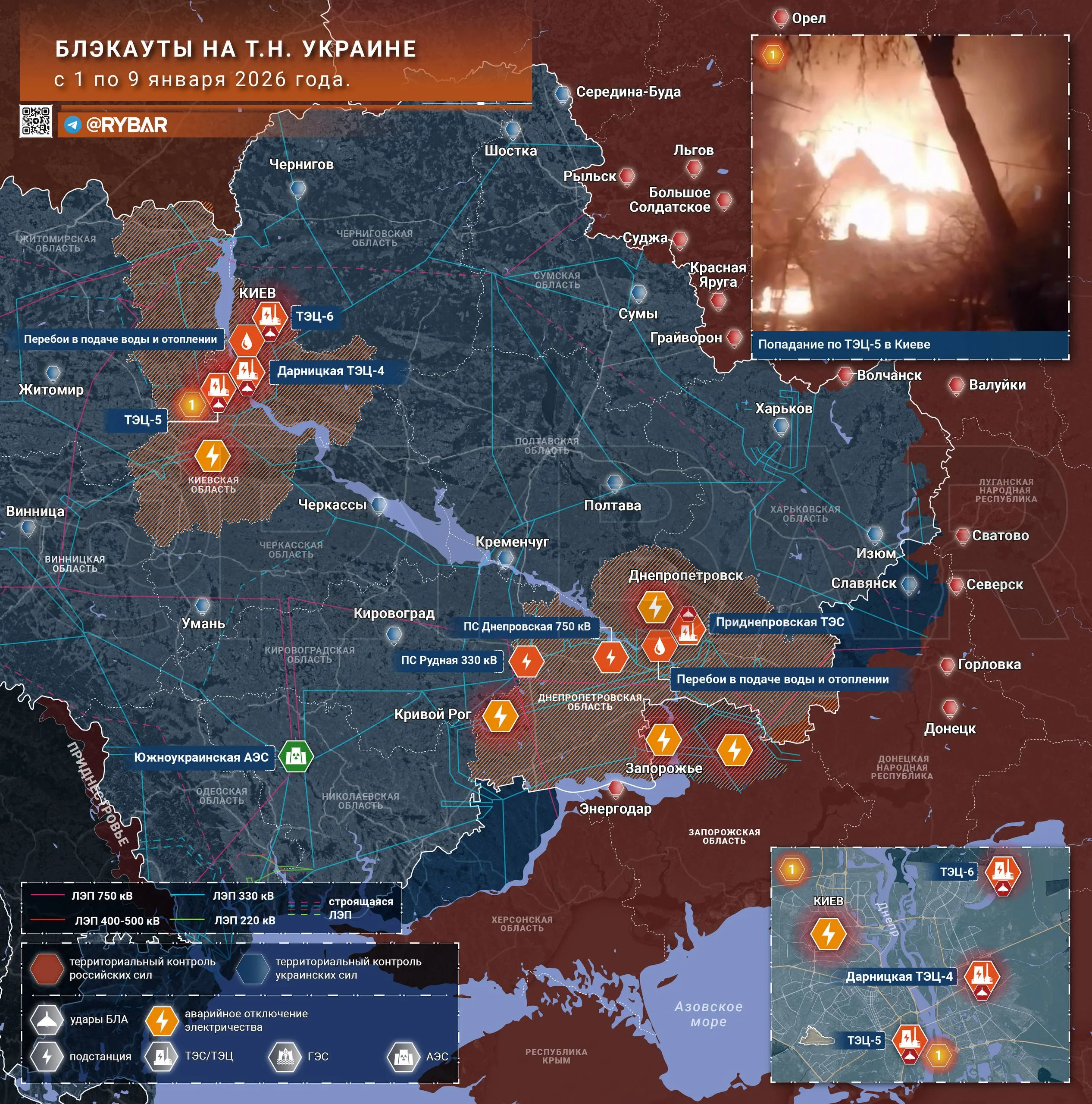 ▪️Комбинированный удар дронов и ракет пришелся по окрестностям ТЭЦ-5, также были отмечены взрывы у ТЭЦ-6 и 4. Сразу после налета была вновь обесточена левобережная часть Киева, позднее днем 9 января аварийные отключения были введены и на правом берегу.