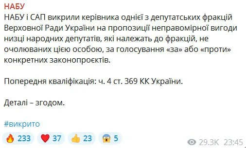 Само антикоррупционное бюро заявило, что разоблачило главу одной из фракций Рады «в предложении неправомерной выгоды другим депутатам за голосование по законопроектам», идет расследование по статье УК о подкупе.