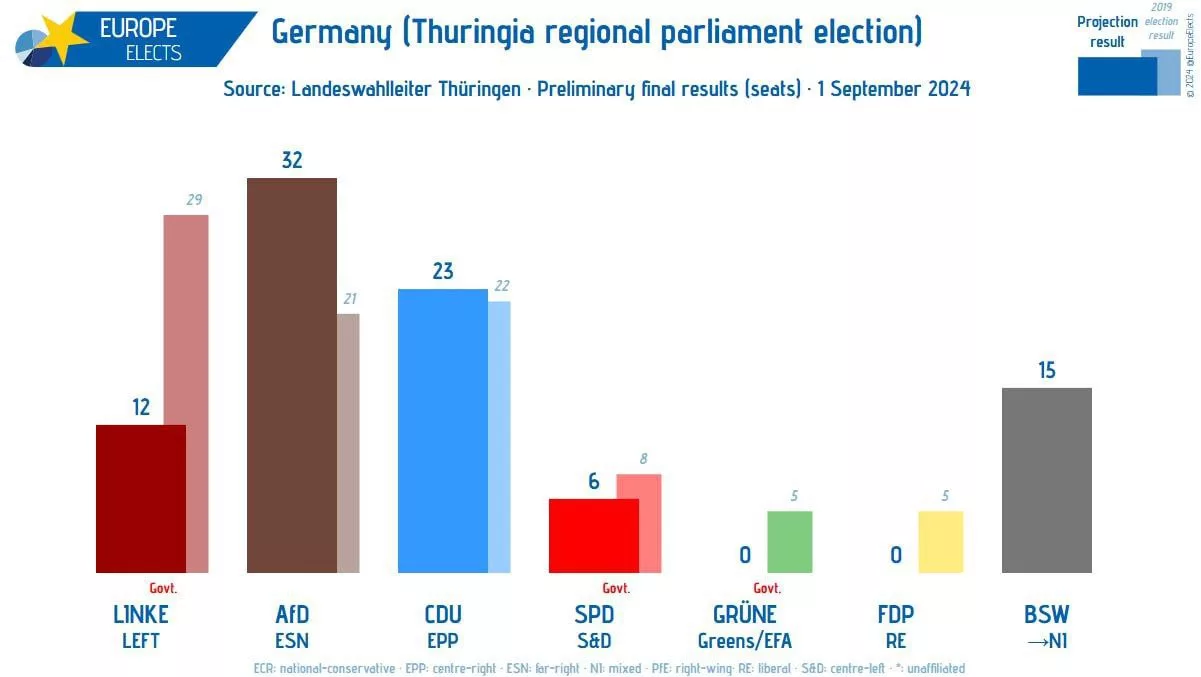 Прошедшие на этих выходных выборы в двух немецких восточных землях — Саксонии и Тюрингии, где в первой, ХДС с огромны трудом удалось вырвать победу у «Альтернативе для Германии» (АдГ), а во втором (см. скрин 1) с треском проиграть (причем здесь впервые в истории нынешней ФРГ может быть сформировано т.н. «альтернативное» правительство, куда войдет эта самая АдГ), могут стать для страны переломными.