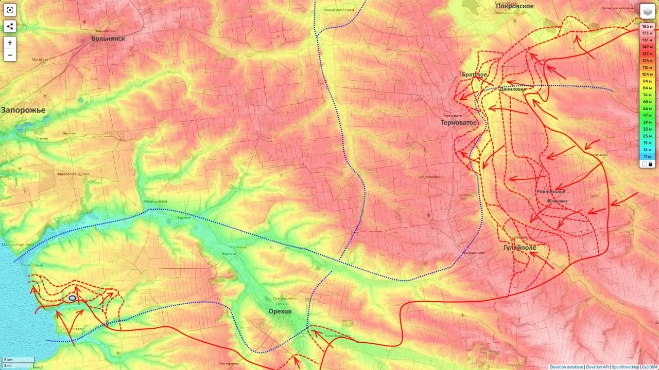 Которое таким образом уже охвачено с трех сторон. И противнику будет крайне трудно его в текущей ситуации удержать. А освобождение Терноватого будет обозначать прорыв оборону ВСУ на реке Ганчур на оперативную глубину. В который далее можно будет вводить войска и развивать его, заходя в тыл Ореховской группировке противника с северо-востока.