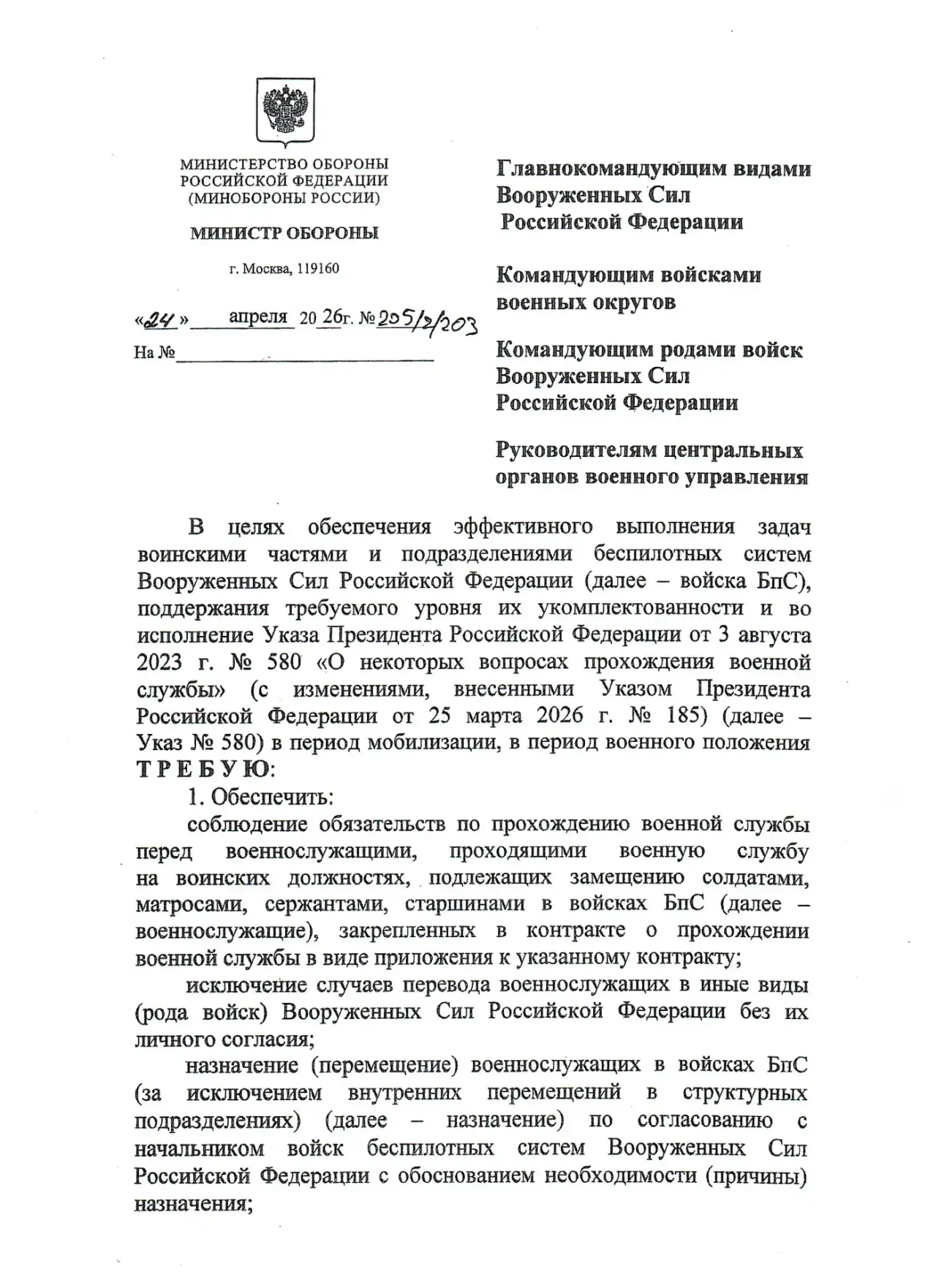 А засветившийся документ лишний раз подтверждает, что в Минобороны вопрос по спецконтрактам в войсках БпС на особом контроле. То, что запреты на переводы беспилотчиков были введены, об этом заявлялось и ранее. Сейчас для повышения ответственности Министр обороны всем командирам дополнительно довел задачу, понятно с кого спрашивать.