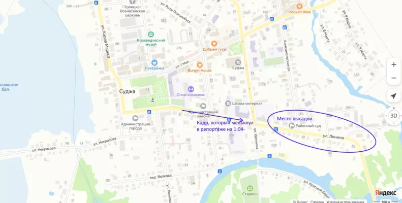 Точек привязки немного, но их достаточно, чтобы понять, что везли итальянскую корреспондентку по улице Ленина мимо районной администрации (см. скрин, не путать с городской) в сторону реки. И вероятнее всего в районе излучины высадили.