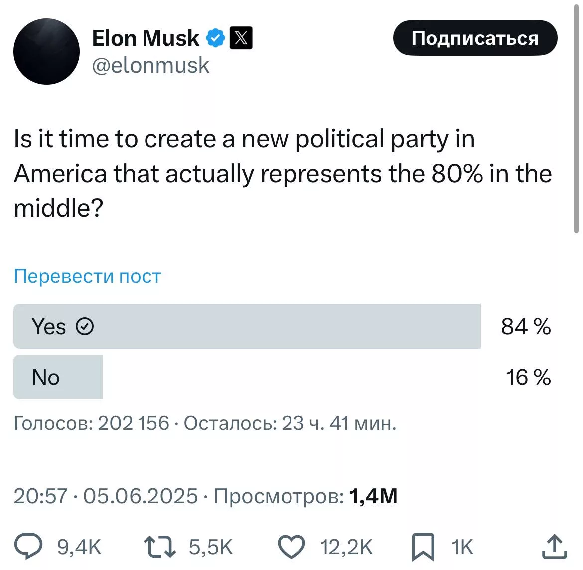 На фоне ссоры с Дональдом Трампом, Илон Маск запустил на своей страничке в «Х» голосование по поводу необходимости создания «партии 80%» американцев, которые посередине.