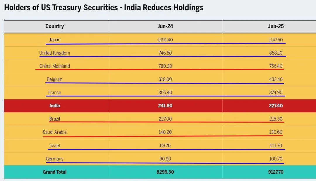 Например, маркер американских «трежерис» четко и однозначно указывает на то, что Индия движется в кильватере Китая и России, а не США. Она, как и все без исключения НЕЗАПАДНЫЕ страны избавляется от американских долгов.