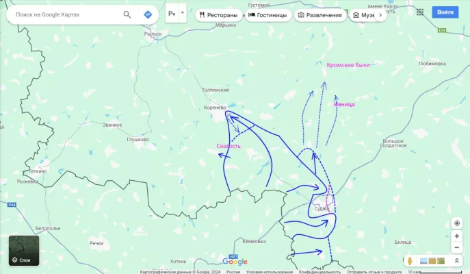 Также, подтянув резервы противник, начал зачищать образовавшийся «карман» юго-западнее Коренево между границей и рекой Сейм, чтобы обеспечить левый фланг своего наступления на Рыльск, правый фланг которого обеспечивают силы противника ведущие бой в районе Кромских Быков.