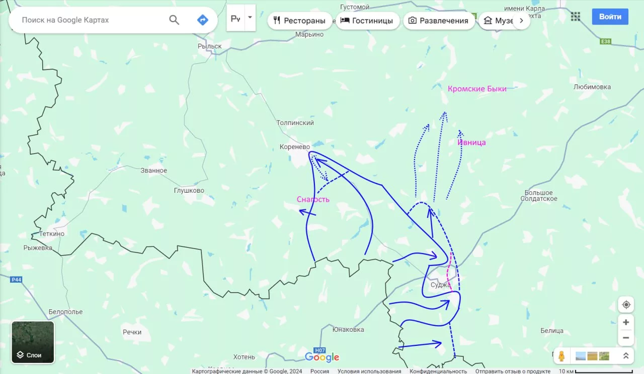 Предчувствия не обманули. Противник таки ввел бой свежие силы и сегодня пытается прорваться по направлению к Льгову. Причем, то, что вначале было похоже на разведку боем, ко второй половине дня превратилось в полноценное сражение в районе н.п. Ивница, где мобильная бронегруппа противника и закрепилась. Бои сместились к следующему селу Кромские Быки. Это уже по прямой меньше, чем 30 км до Курской АЭС.