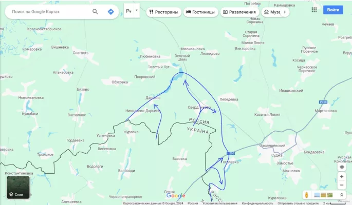 К утру ситуация с линией фронта в районе Суджи-Коренево более менее прояснилась. Противнику удалось отбросить наши части по линии Николаево-Дарьино-Дарьино-Свердликово-Гоголевка-Олешня и там закрепиться.