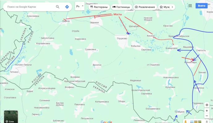 Противник пробует, но пока не может развить здесь свой успех. Кроме уничтоженной одной переправы в Глушково, а также сильно поврежденной в Званом, никаких значимых успехов у него нет.