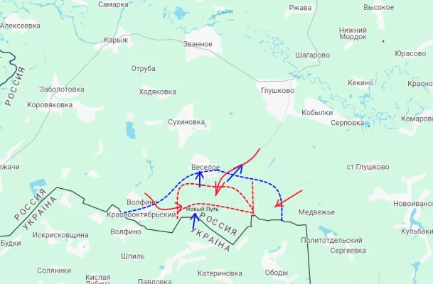 Для начала поговорим о боях восточнее Суджи. Наши атаки здесь со стороны н.п. Пушкарное начались одновременно с атакой 155-ой бригады морпехов. Главной целью ее было выбить противника из района н.п. Михайловка, взять его под контроль и тем самым обеспечить заход в находящуюся севернее Мартыновку наших частей, чтобы сделать из этого села базу для наших дальнейших атак.
