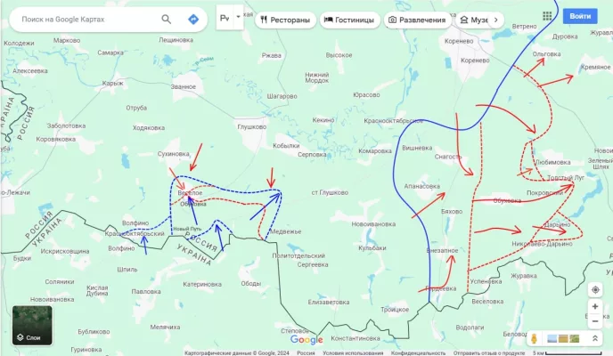 Начнем с Глушковского участка. Вчера контратакой наши части выбили противника из Веселого, и в течении всего дня шел упорный бой на южной окраине поселка, где ВСУшники закрепились в районе лежащего рядом поселка Обуховка. Также нам удалось подвинуть противника назад и в районе Медвежьего. Но он в свою очередь, сумел занять, лежащий у самой границы западнее поселок Красноктябрьский.