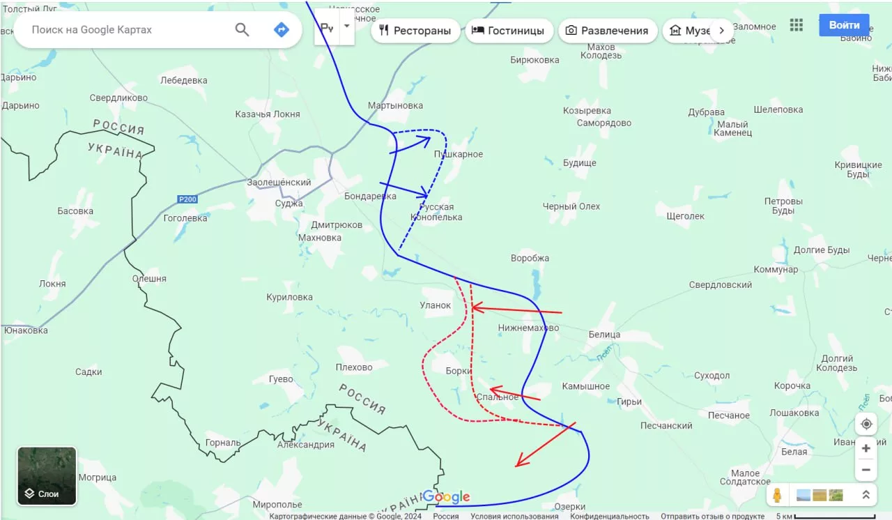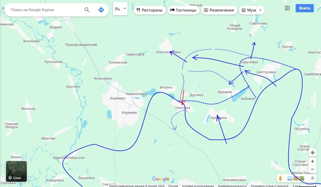 А вот, чуть восточнее, он продолжает пытаться обходить Коренево и пробиваться к трассе Рыльск-Курск. Сегодня он вновь попробовал зайти в Александровку и есть данные, что по итогу его выбить пока не смогли. А вот накат на Сафоновку был отражен.