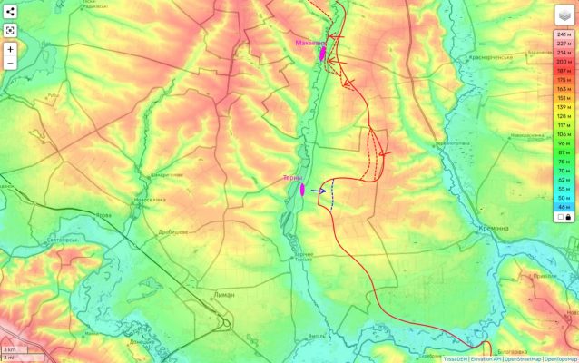 Российская армия продолжает развивать успех, который был ею достигнут накануне. Противник в районе н.п. Макеевка полностью отброшен за реку и пытается выстроить свою оборону на холмах западнее села.