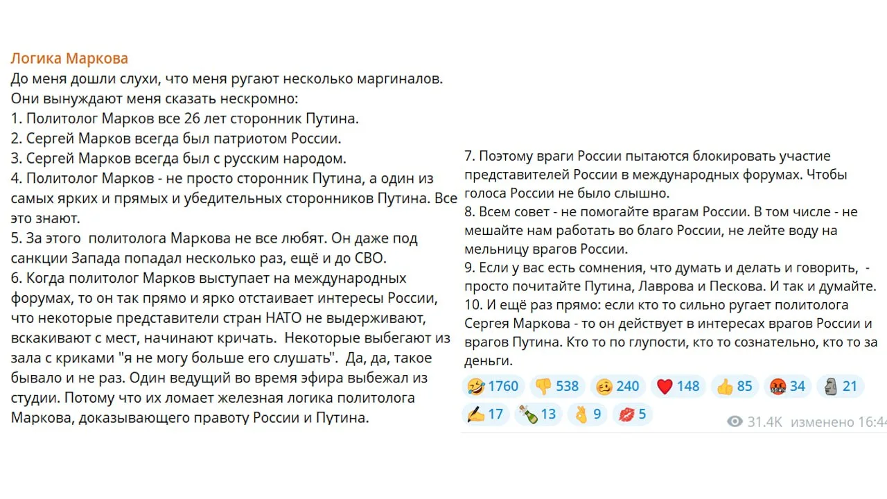 Пытаться тем самым показать, что он, якобы, выше критики на него свалившейся. Но этим, в данном случае политолог Марков, только показывает насколько она его задела. Более того задела именно ЗА ДЕЛО.