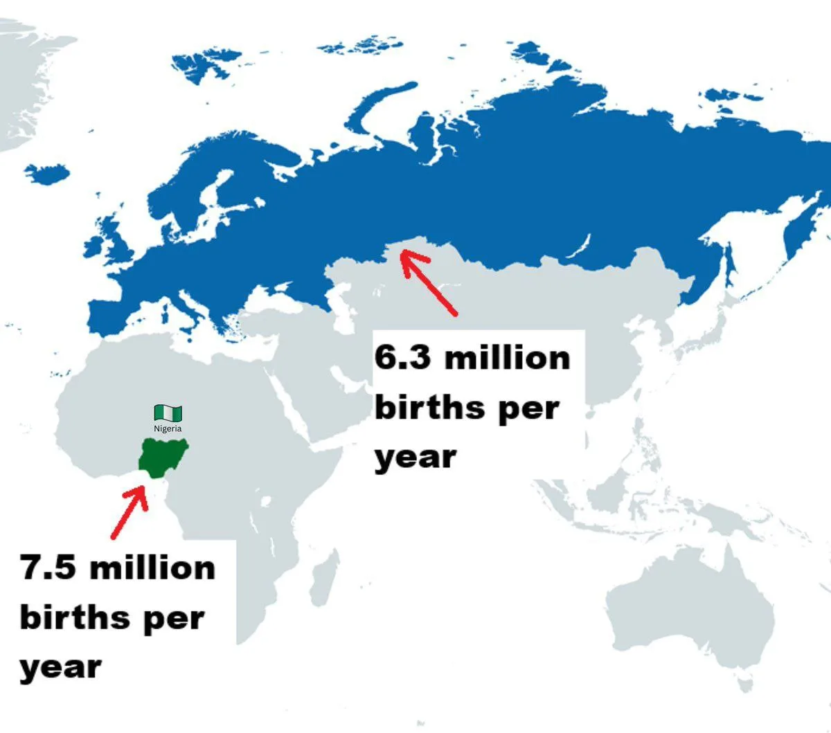 Что касается демографической судьбы белого населения планеты (а значит и их роли в мире) достаточно просто посмотреть на второй скрин. Мы видим, что в 2024 году во всех т. н.«белых» странах Евразии количество рождений много меньше, чем в одной только Нигерии. При этом надо помнить, что во всех этих «европейских» странах уже сегодня количество «небелых» рождений довольно высокая (в среднем 20%). А значит, если ничего не изменить, то их не ждет ничего хорошего.
