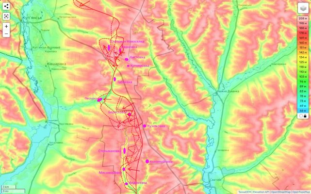 Вероятнее всего они будут пробовать отсюда подняться на холм и попытаться выйти в тыл частям противника обороняющимся чуть севернее, чтобы в конечном итоге очистить от него весь этот большой холм, который прикрывает подступы к Купянску с юго-востока.