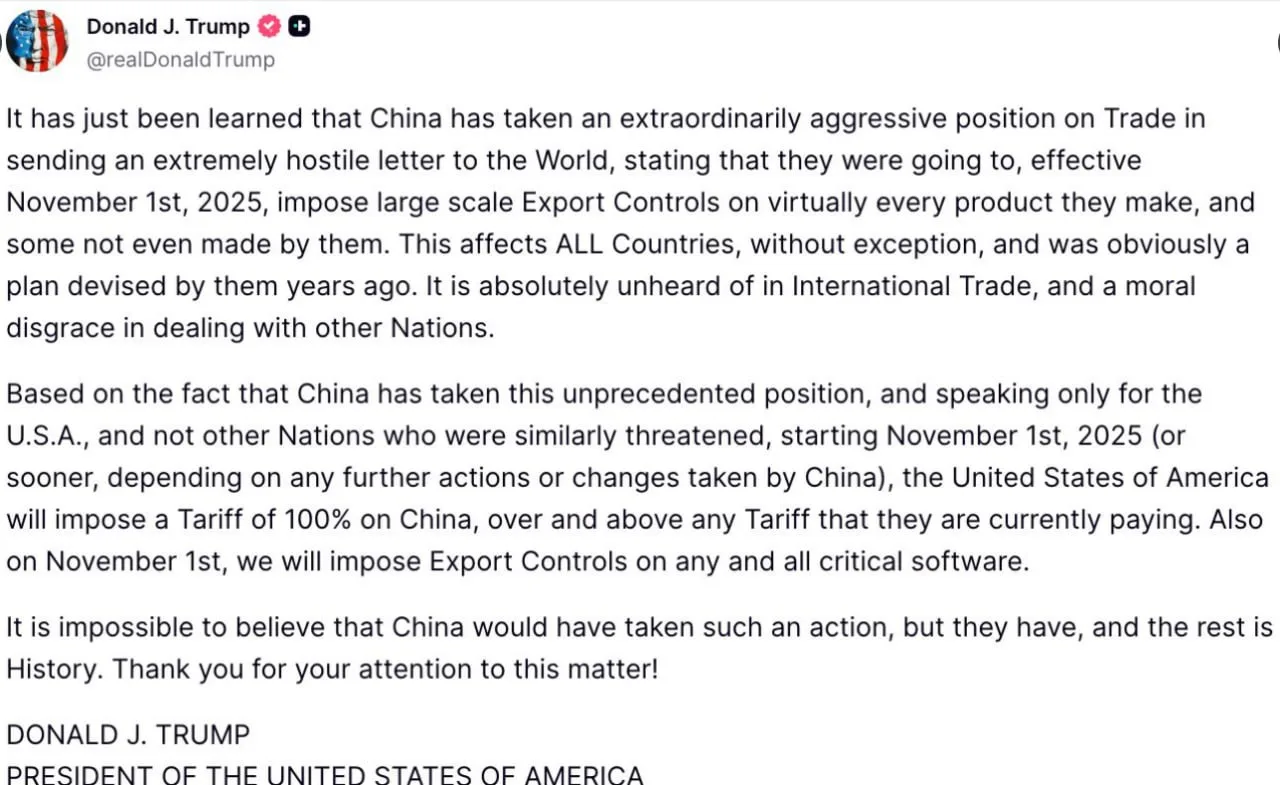 И отсюда новая фаза экономической войны была лишь вопросом времени. И она начнется с 1 ноября 2025 года введением США пошлин в отношении китайских товаров по схеме «все предыдущие пошлины +100%». И это ответ Вашингтона на решение Пекина ввести экспортный контроль на свои товары. А то решение, в свою очередь было ответом на непубличное решение блокировать Китаю доступ к американским технологиям и продукции.