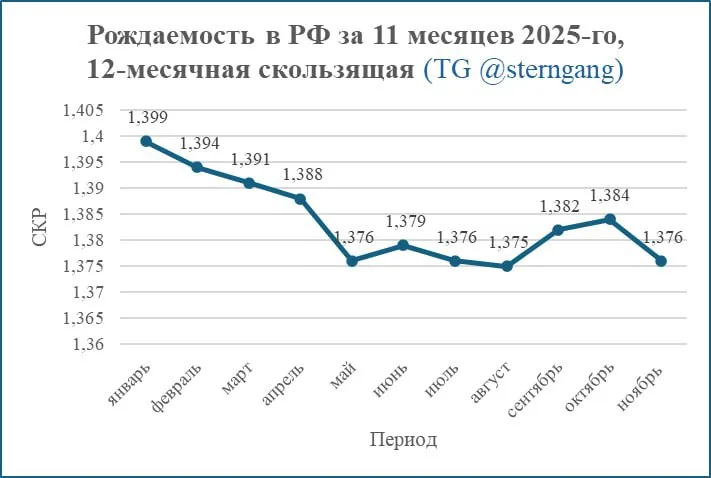 К сожалению, судя по данным ноябрьской статистики, несмотря на «всплеск» сентября-ноября переломить тенденцию пока не удалось (в таблице показано помесячное значение СКР — суммарного коэффициента рождаемости, в России).