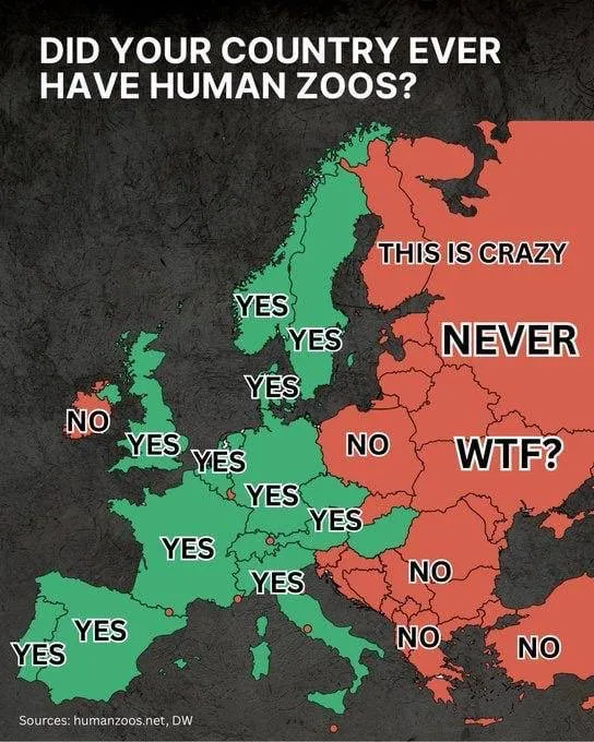 На скрине карта. На ней страны Европы закрашены исходя из ответа на вопрос — были ли на их территории человеческие зоопарки.