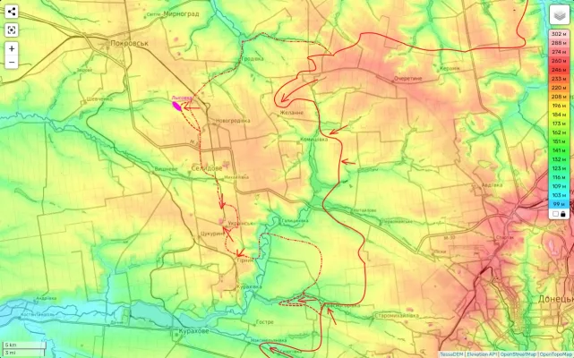 Причем, наши части атакуют (и успешно) даже в районе между Селидово и Покровском, зайдя на окраины Лысовки (за которую начались бои). Также есть небольшие продвижения в южной части Украинска, северной части горняка, и в районе Желанного Первого.