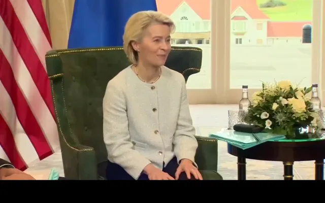 Разговор Урсулы (фот дер Ляйен) и Дональда (Трампа). Урсула скромно сидит на стульчике и вкрадчиво спрашивает, а нельзя ли пошлины для ЕС сделать меньше 15%.