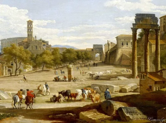 Две «картины». Первая называется «Вид на Римский форум». Автор Джованни Паоло Паннини, 1747, Хранится в художественном музее Уолтерса в США.